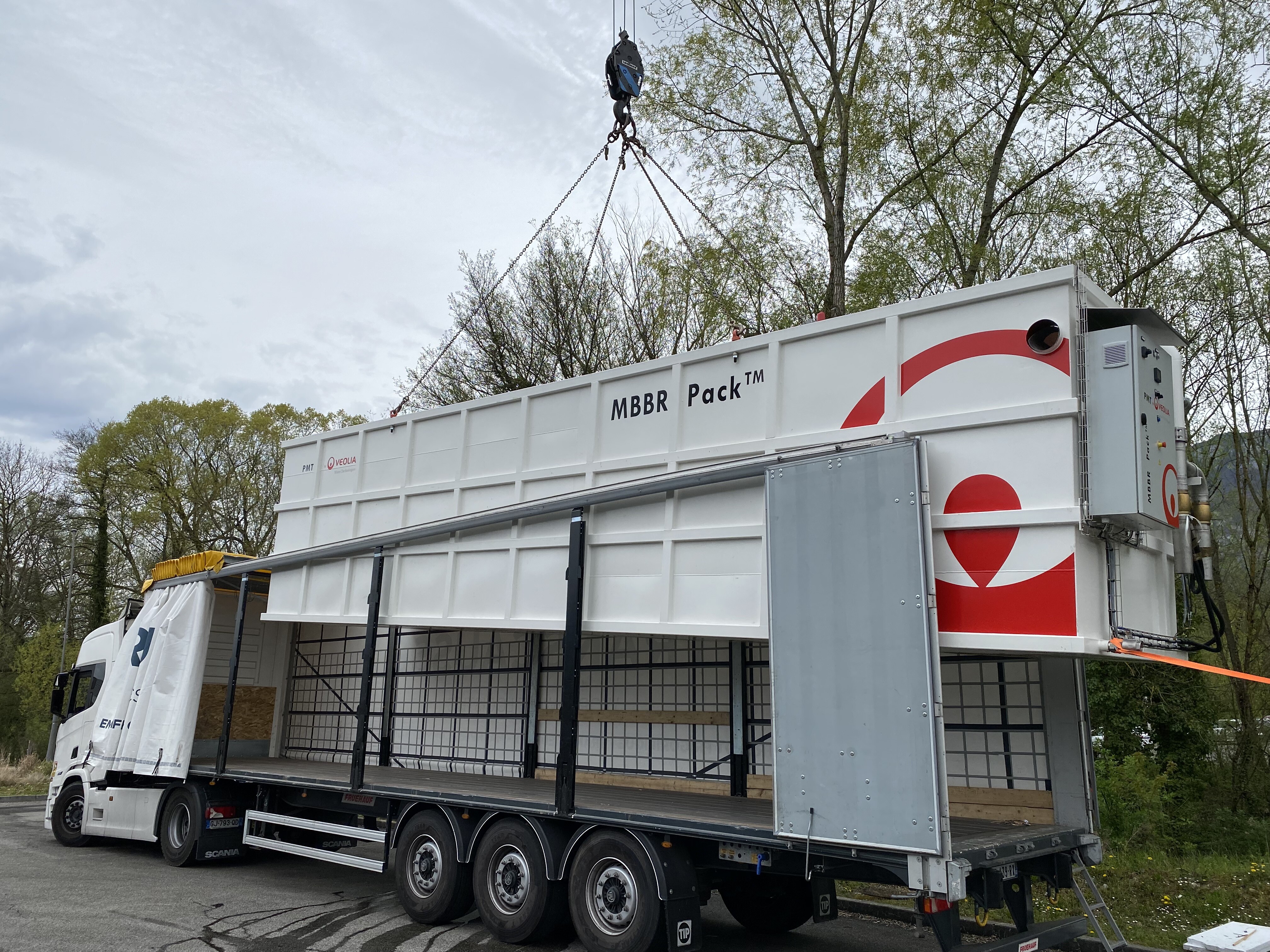 Pour répondre à ce challenge, les deux entreprises ont opté pour la solution MBBR Pack. Cette technologie présente plusieurs avantages clés, parfaitement adaptés à leurs besoins. Tout d’abord, son design compact, capable de traiter entre 500 et 600 kg de DCO par jour et par unité, permet une installation rapide et facile sur site. Cela a permis de réduire les coûts d’exploitation tout en minimisant les interruptions lors de la mise en place du nouveau système.